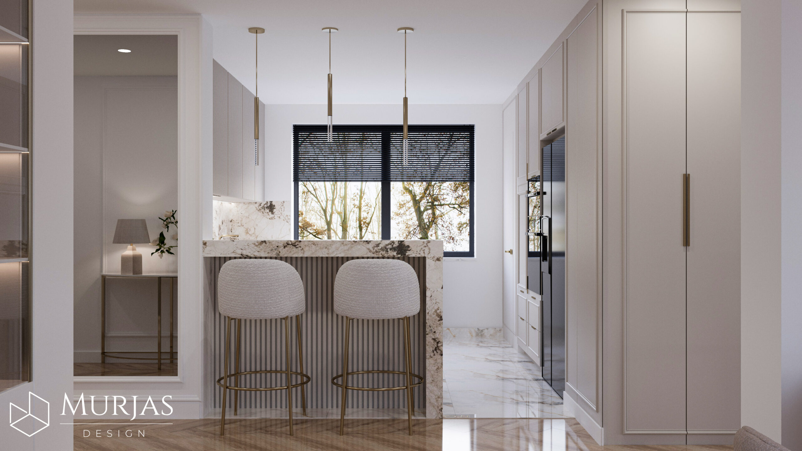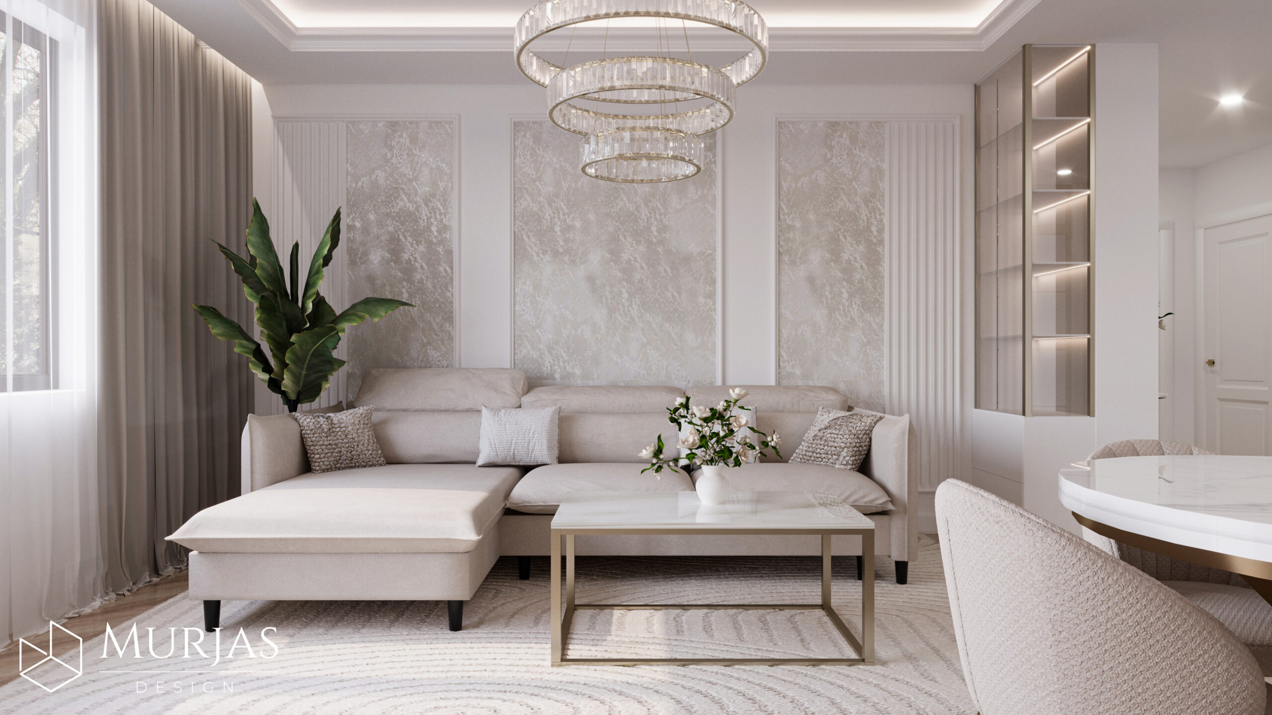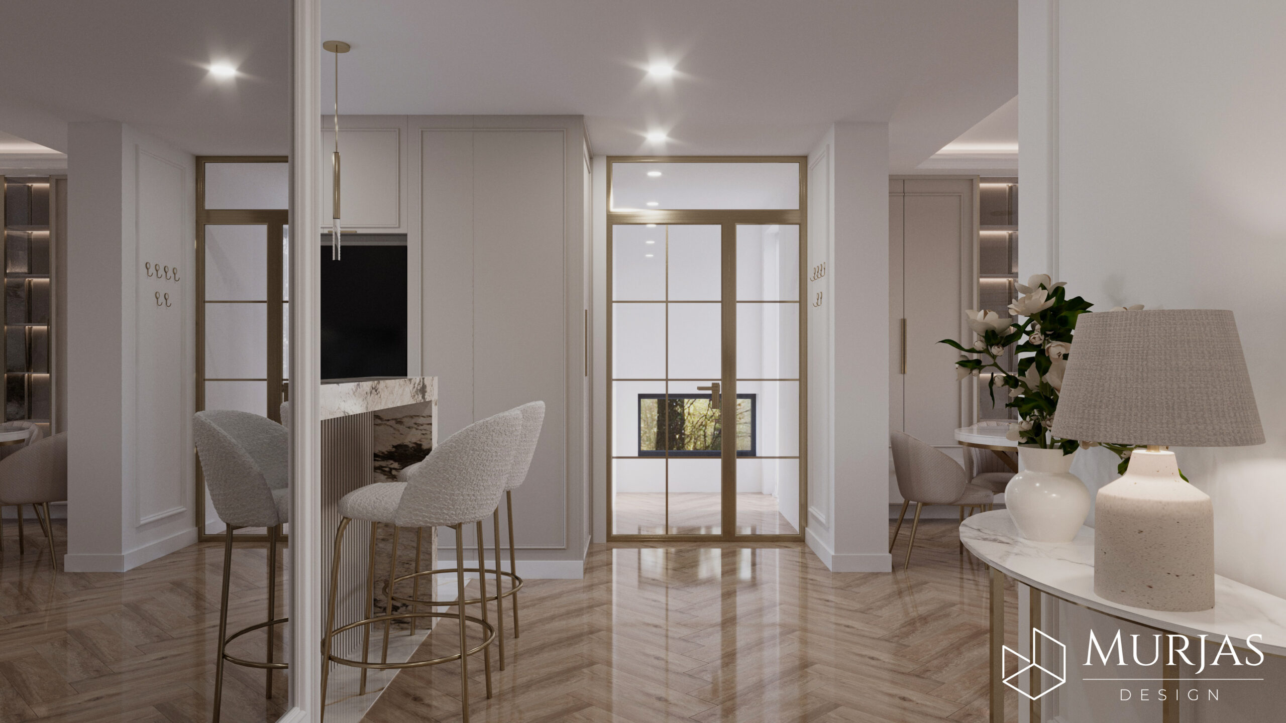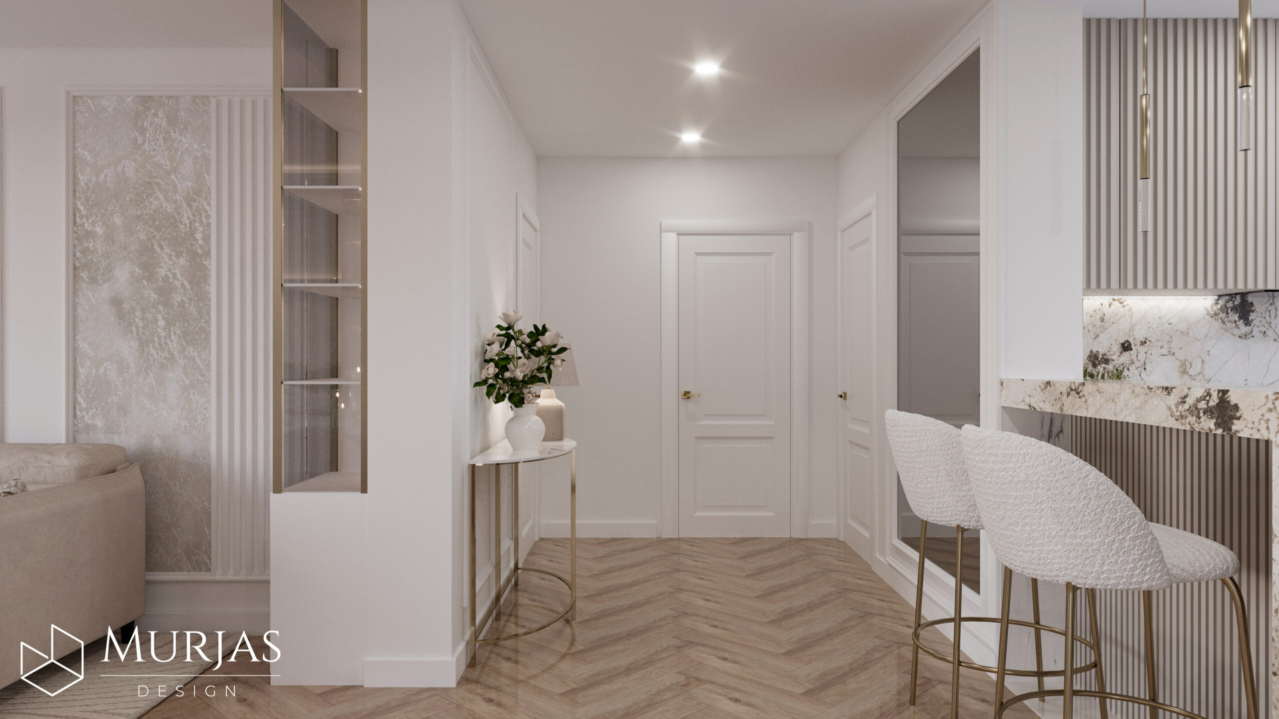 Nowoczesne wnętrze w odcieniach beżu z eleganckimi złotymi akcentami to połączenie klasyki z nowoczesnym stylem. Naturalne panele winylowe w jodełkę na podłodze wprowadzają ciepło, a klasyczna sztukateria oraz złota farba strukturalna na ścianach nadają przestrzeni wyjątkowy, luksusowy charakter. Całość tworzy harmonijną, elegancką przestrzeń pełną subtelnego blasku.