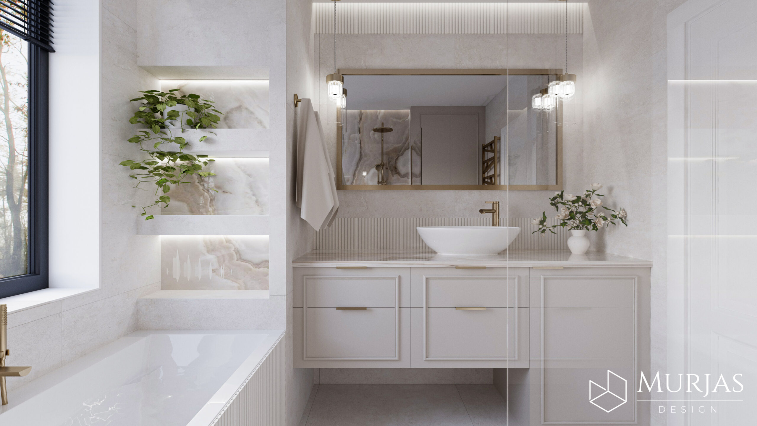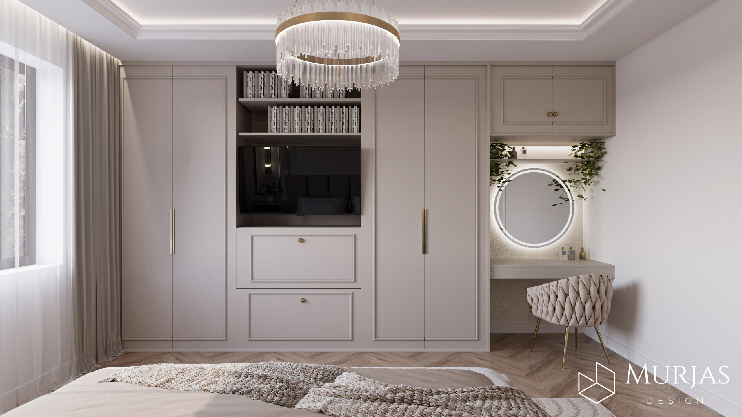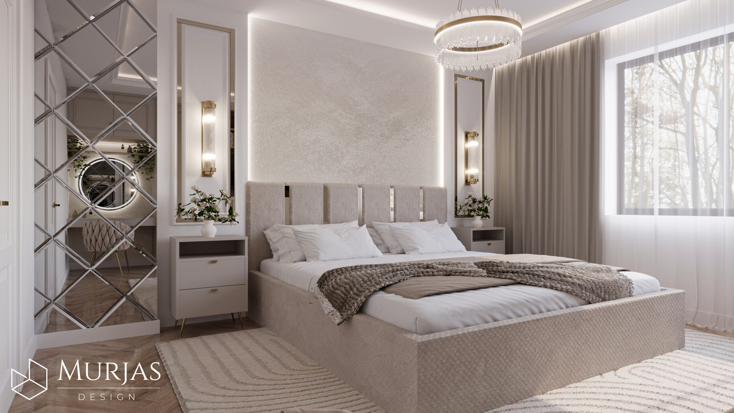 Nowoczesne wnętrze w odcieniach beżu z eleganckimi złotymi akcentami to połączenie klasyki z nowoczesnym stylem. Naturalne panele winylowe w jodełkę na podłodze wprowadzają ciepło, a klasyczna sztukateria oraz złota farba strukturalna na ścianach nadają przestrzeni wyjątkowy, luksusowy charakter. Całość tworzy harmonijną, elegancką przestrzeń pełną subtelnego blasku.