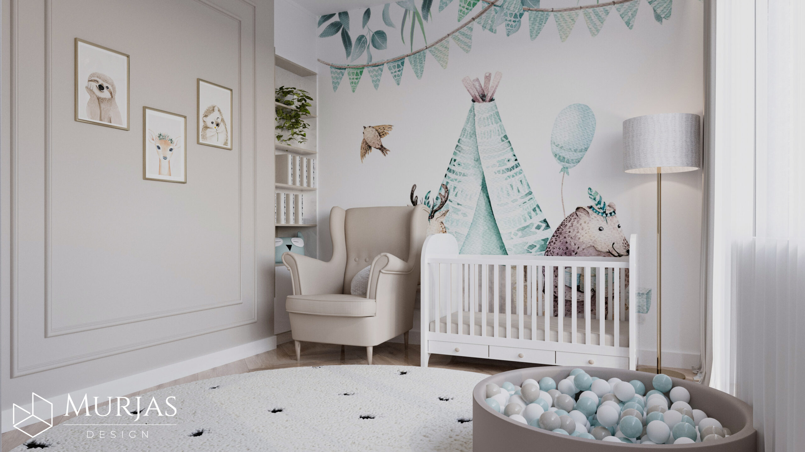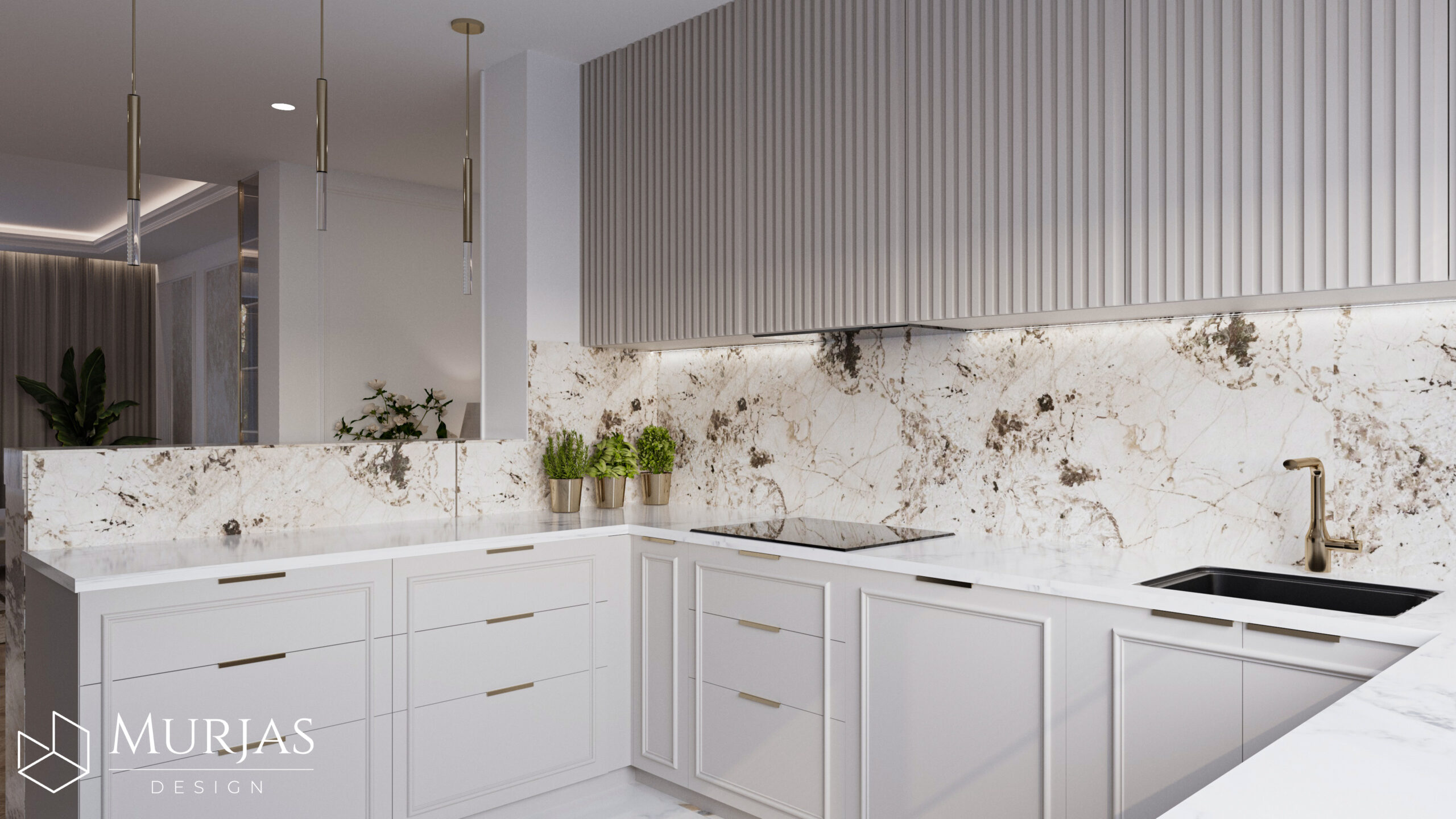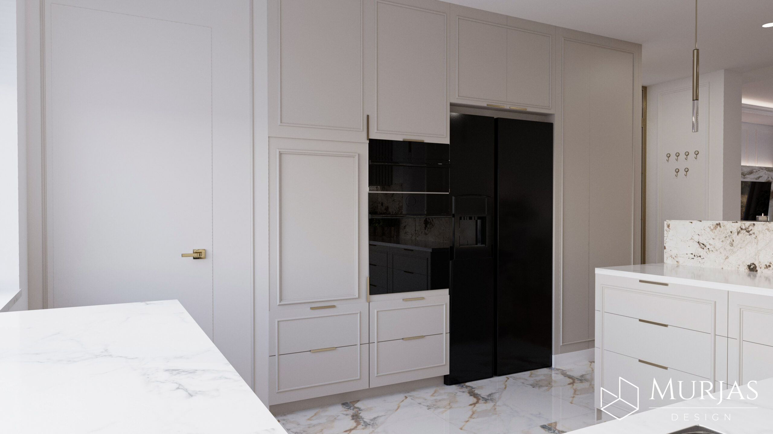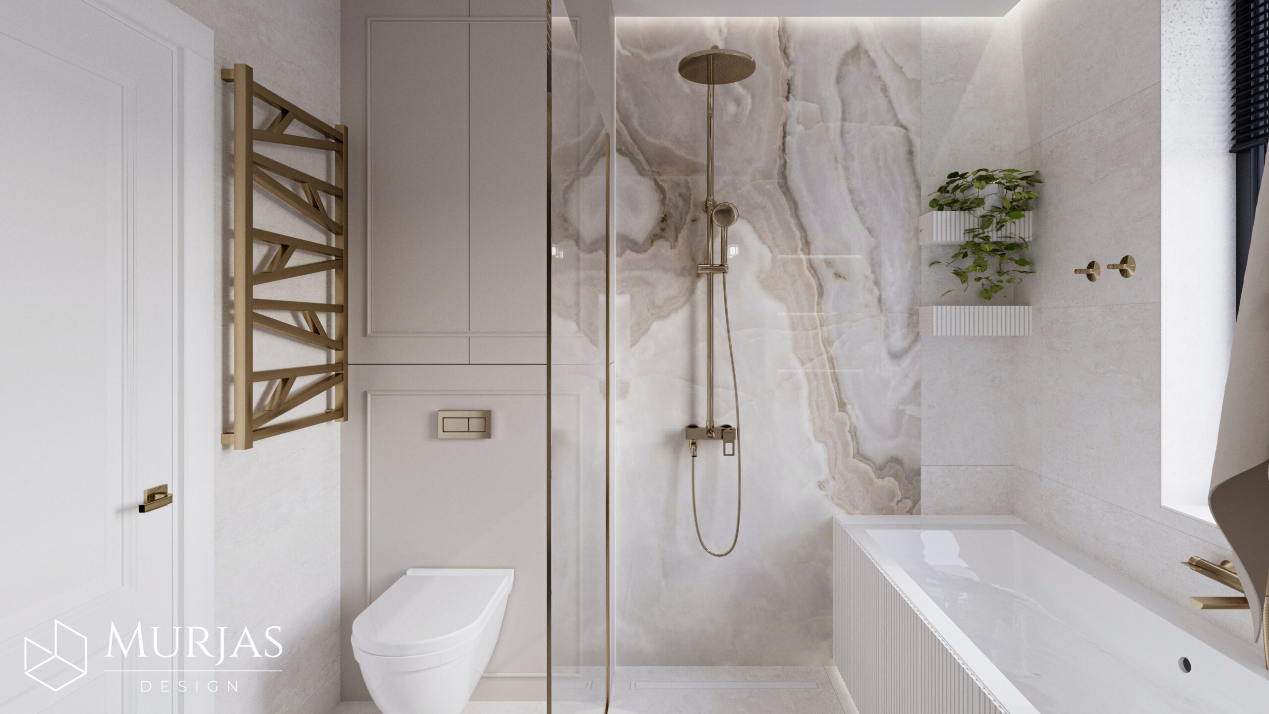 Nowoczesne wnętrze w odcieniach beżu z eleganckimi złotymi akcentami to połączenie klasyki z nowoczesnym stylem. Naturalne panele winylowe w jodełkę na podłodze wprowadzają ciepło, a klasyczna sztukateria oraz złota farba strukturalna na ścianach nadają przestrzeni wyjątkowy, luksusowy charakter. Całość tworzy harmonijną, elegancką przestrzeń pełną subtelnego blasku.