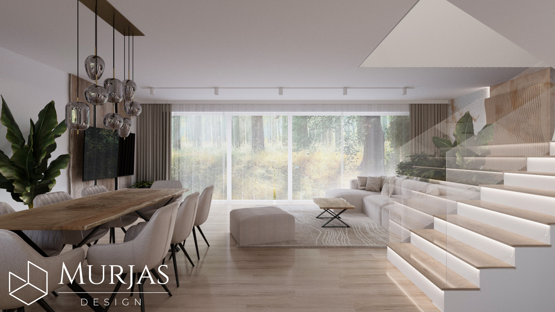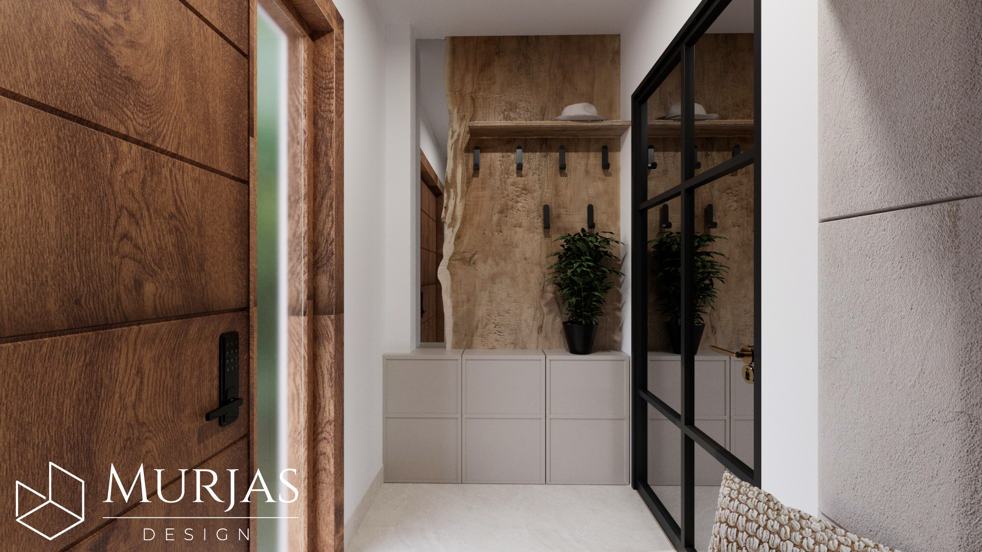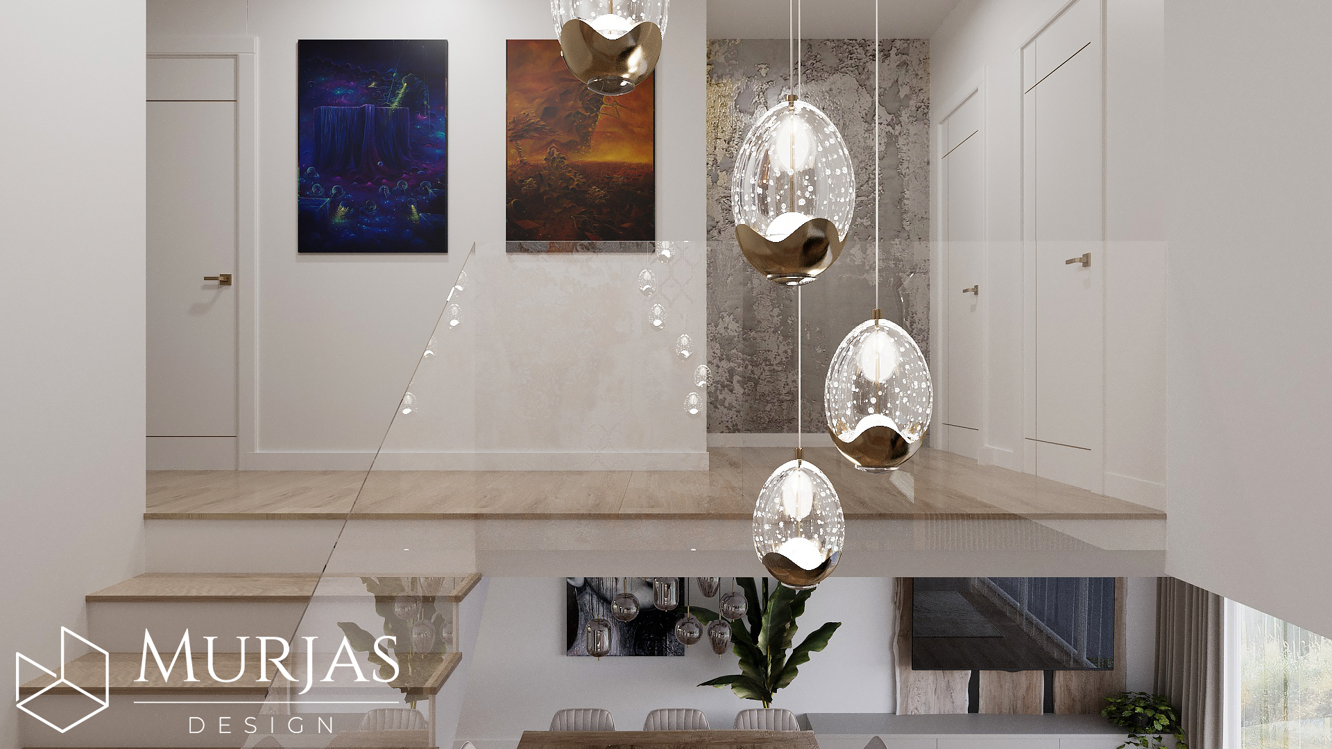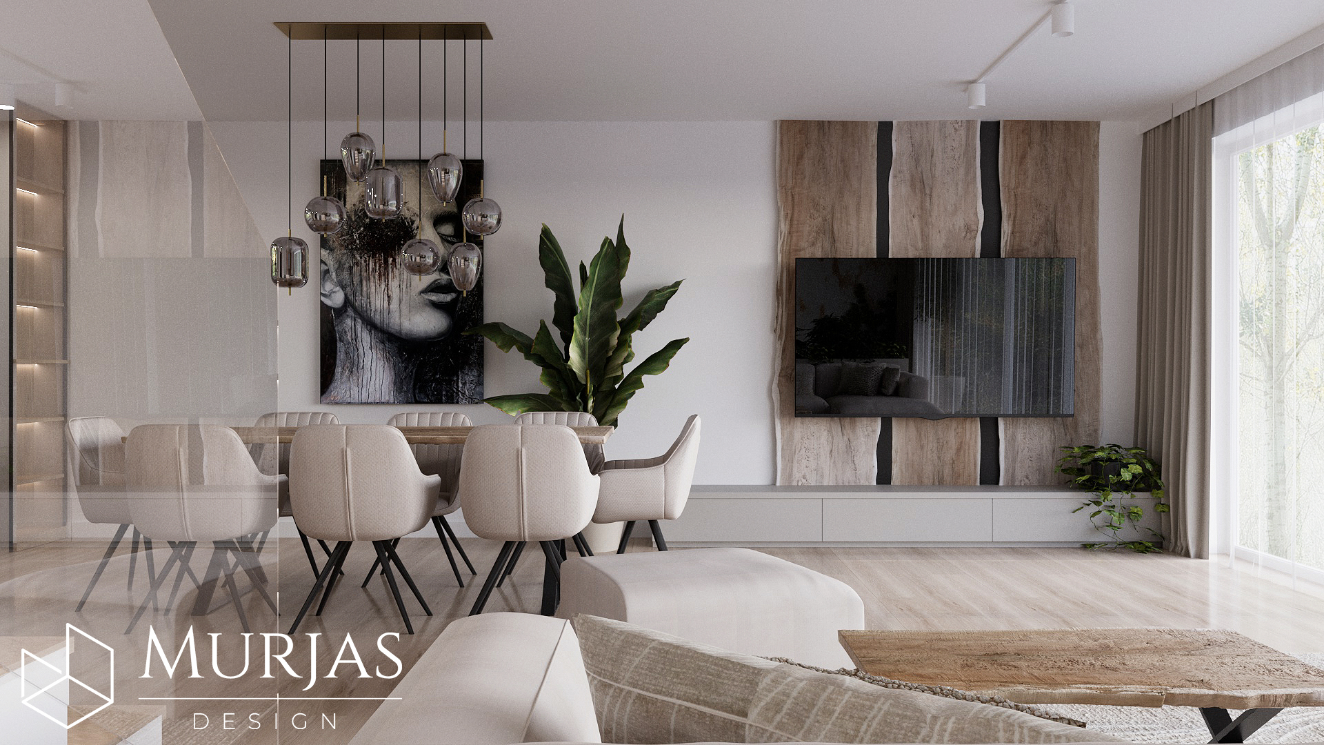 Nowoczesne wnętrze, w którym króluje elegancka prostota i dopracowane detale. Przestrzeń utrzymana jest w minimalistycznym stylu, podkreślonym przez wyjątkowy tynk dekoracyjny oraz ścienne monolity z naturalnego drewna. Całość dopełniają nietuzinkowe lampy dekoracyjne, które pełnią funkcję zarówno użytkową, jak i artystyczną. Główne akcenty estetyczne stanowią dzieła sztuki należące do właścicieli, tworząc przestrzeń osobistą, stylową i pełną wyrafinowanego smaku.
