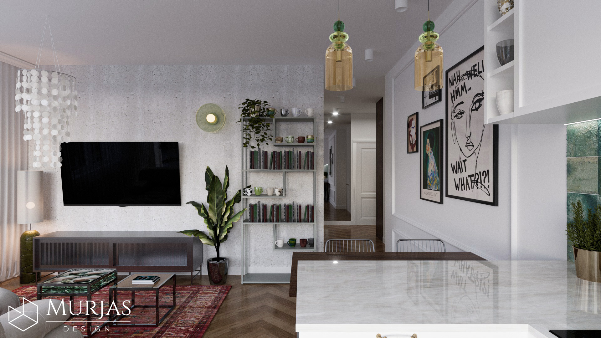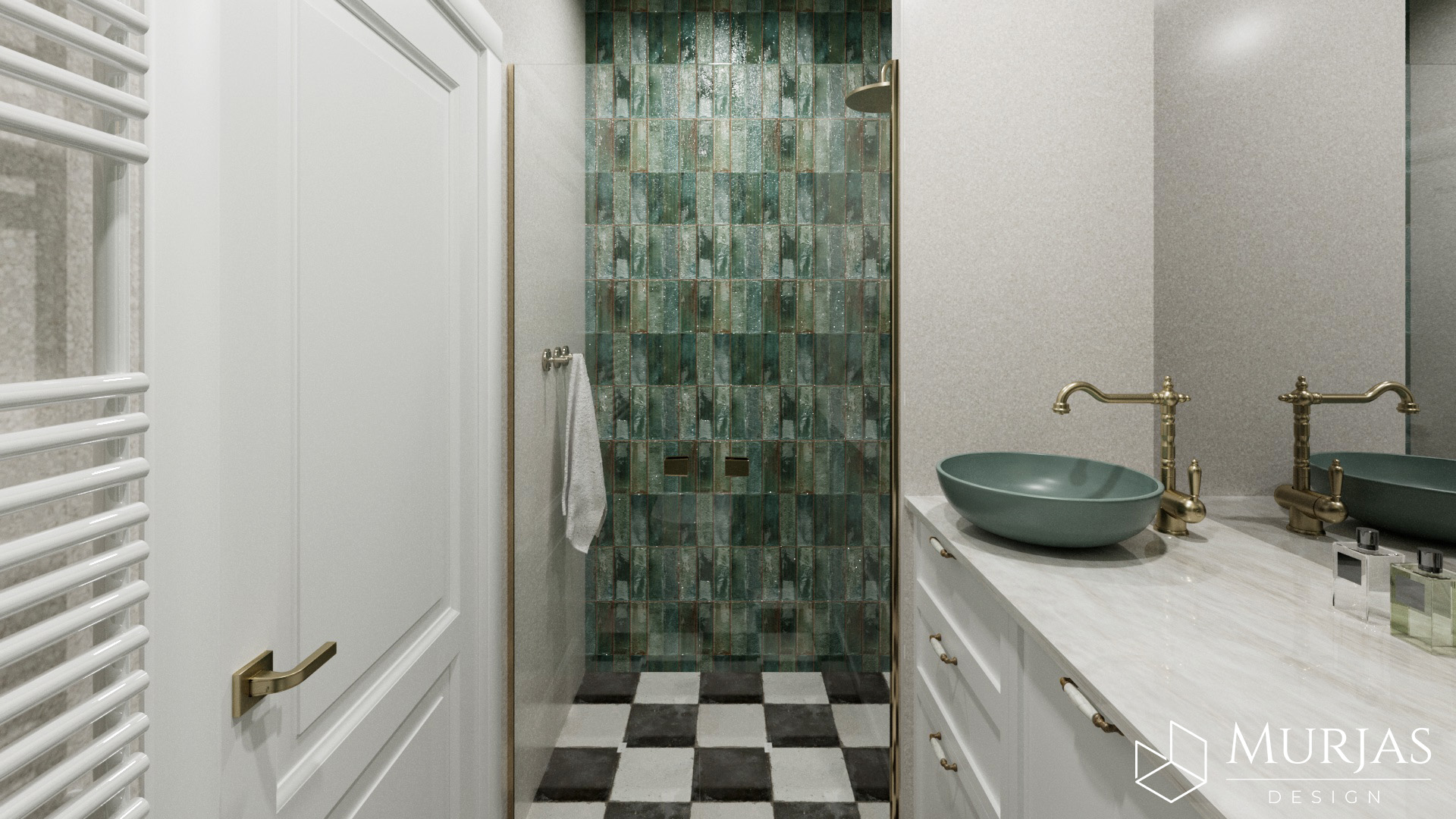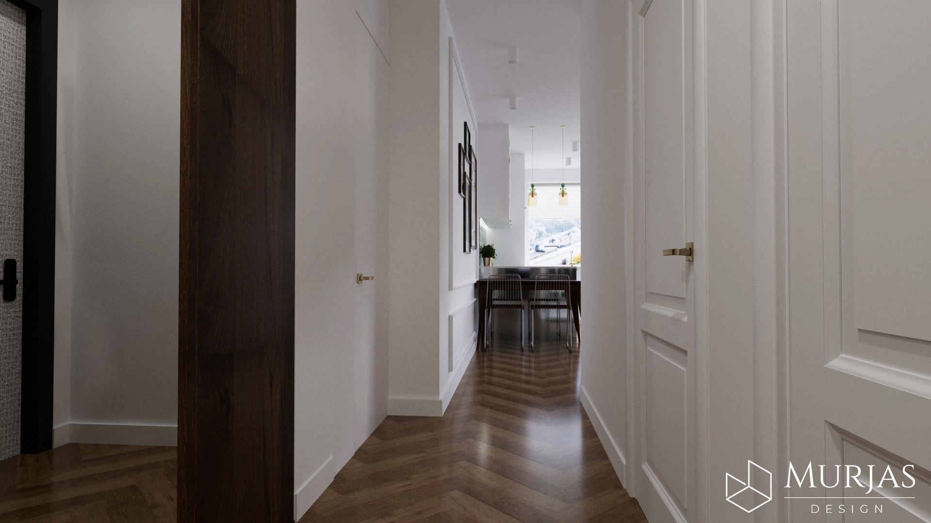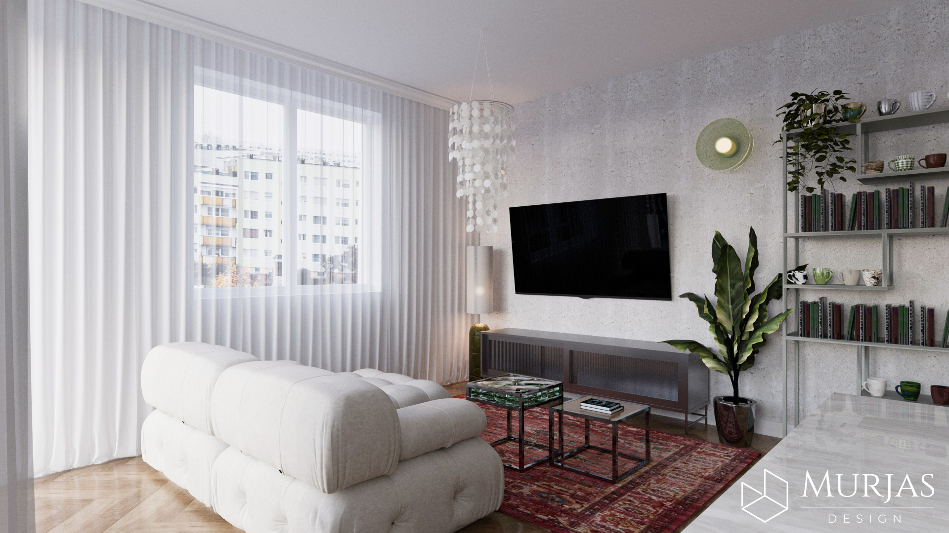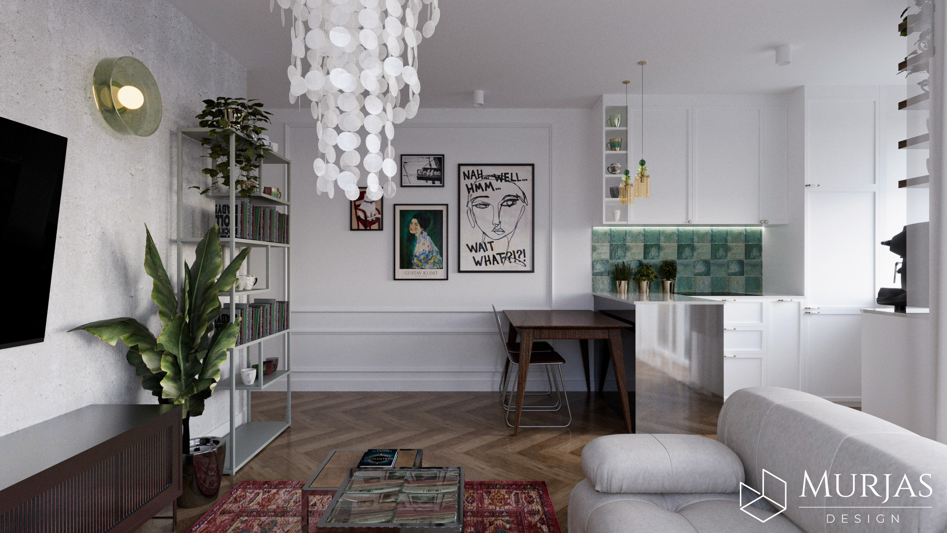 Bazuje na bieli i ciemnym drewnie, wzbogaconym o zieleń i złoto. Klasyczne retro akcenty – stalowe meble, czerwony orientalny dywan, armatura w postarzanym złocie i szachownica płytek w łazience – nadają mu wyjątkowy klimat. Całość dopełniają sztukateria na ścianach, biały beton architektoniczny w salonie oraz tapeta retro w sypialni, które podkreślają ponadczasowy styl tego projektu.