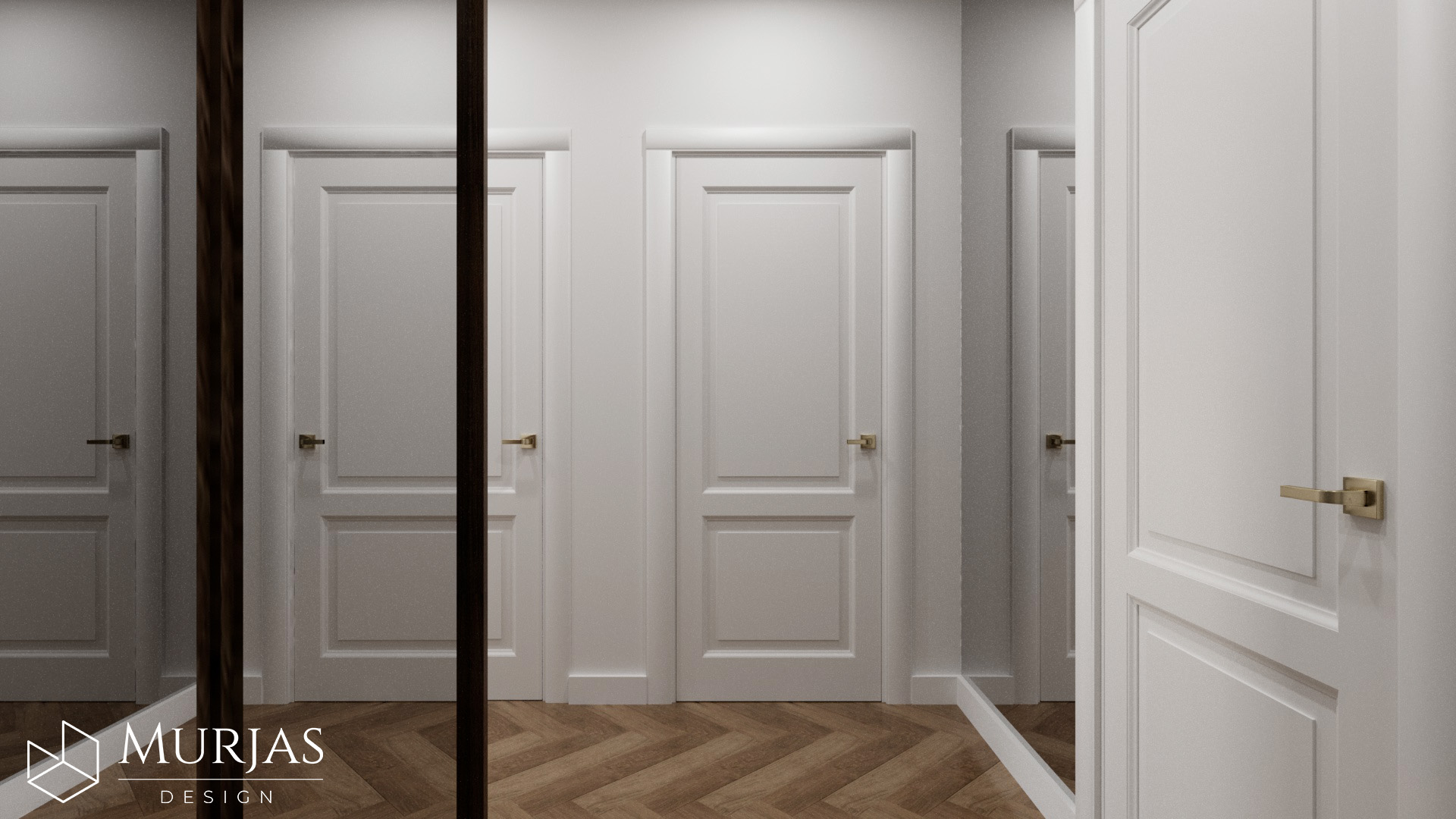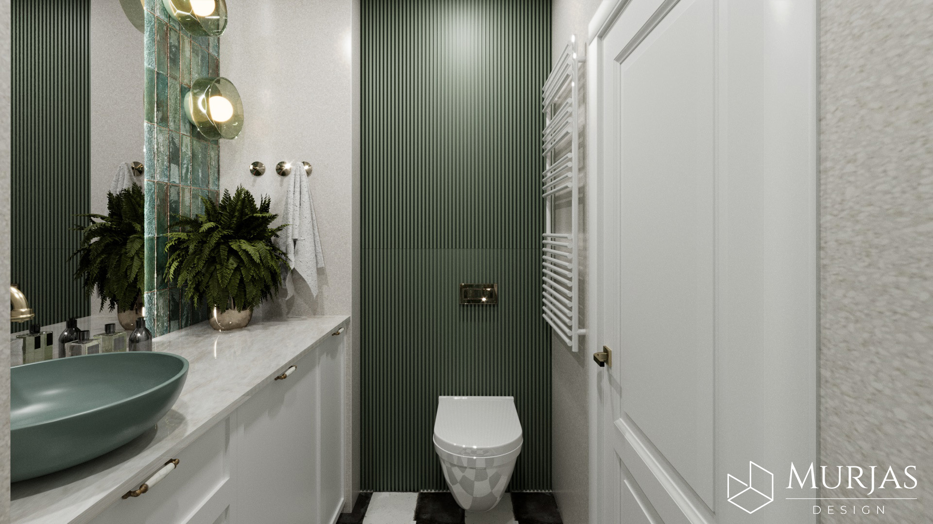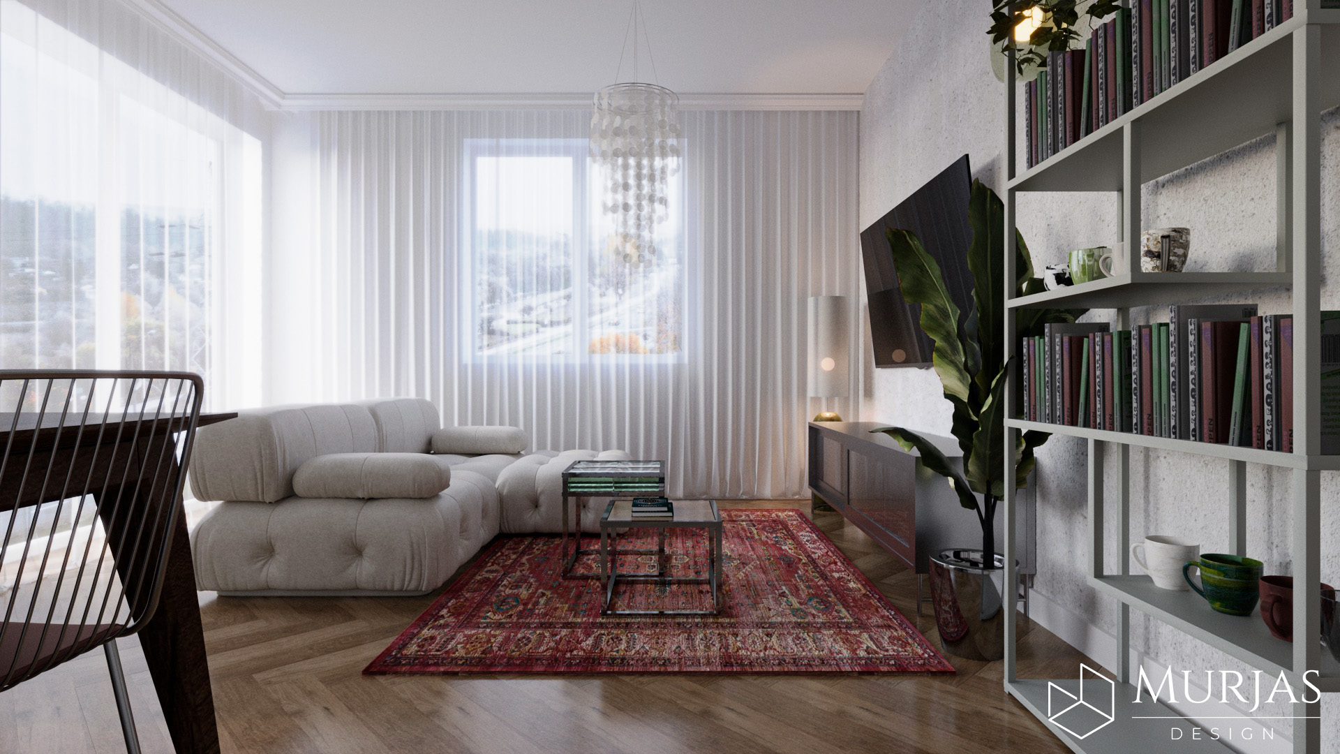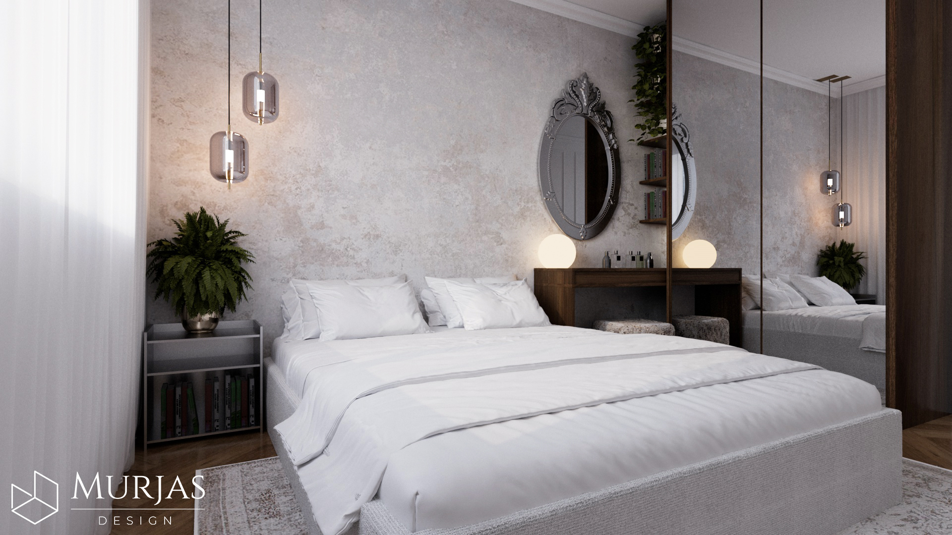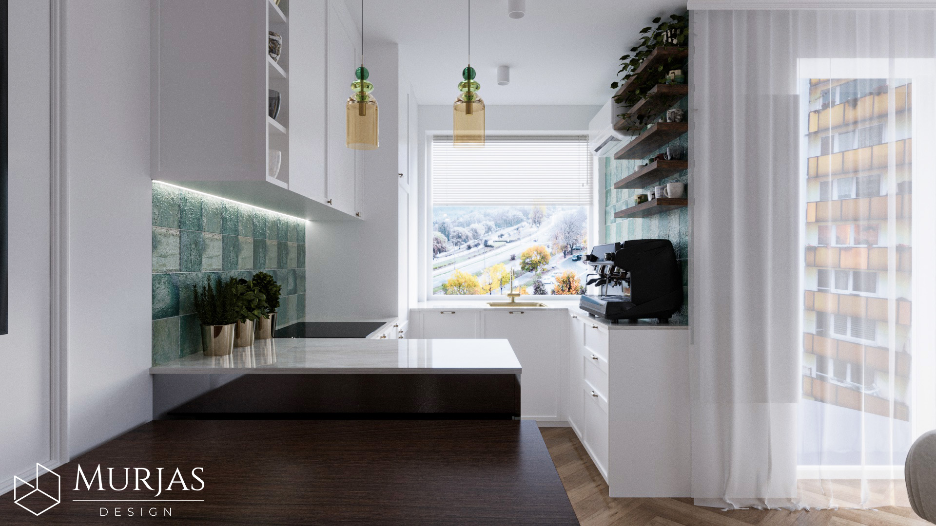 Bazuje na bieli i ciemnym drewnie, wzbogaconym o zieleń i złoto. Klasyczne retro akcenty – stalowe meble, czerwony orientalny dywan, armatura w postarzanym złocie i szachownica płytek w łazience – nadają mu wyjątkowy klimat. Całość dopełniają sztukateria na ścianach, biały beton architektoniczny w salonie oraz tapeta retro w sypialni, które podkreślają ponadczasowy styl tego projektu.